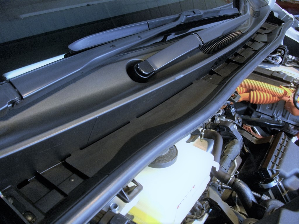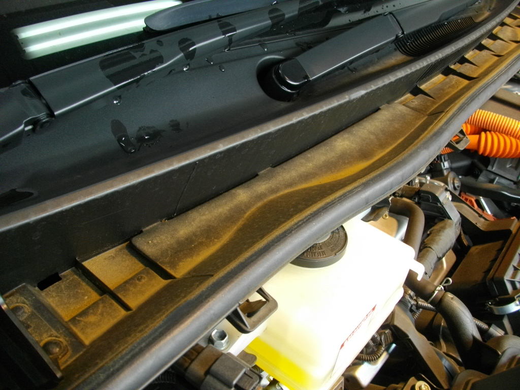 エンジンルームを開けると、カウルパネル付近に1年分の汚れが、ごっそり溜まってます。